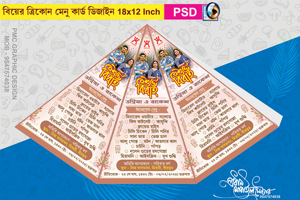 Bengali Bibaha Wedding New Style 3 Three Triangel Tricone Triangle Tribhuj Trivuj Pyramide Side Hand Table Stand Menu Card Design PSD 12×18 Inch_2337 – PMC